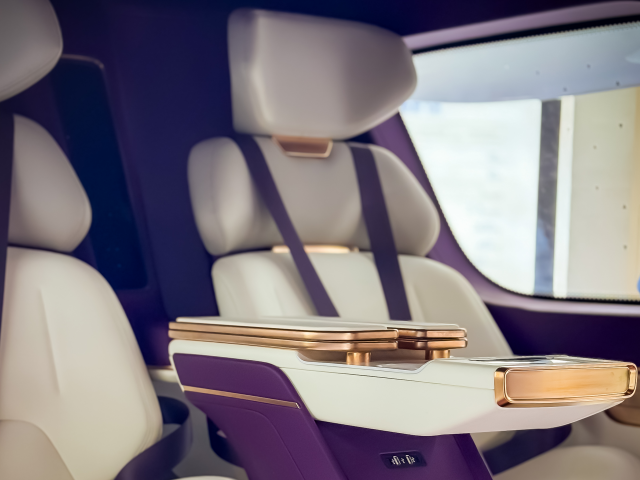 The CMF concept focuses on a colour palette that is both calming and expressive, conveying clarity and luxury. Leather-covered seats create a high-quality ambience and support the demand for comfort on longer journeys. Functional details such as an integrated cooler, a sliding iPad holder and a rotating, compact table allow moments of concentration above the clouds. A starry sky roof, crossed by meteors, expands the space emotionally and adds a special depth to the flight experience. The interior is complemented by a separate, spacious luggage compartment for four 20-inch suitcases.